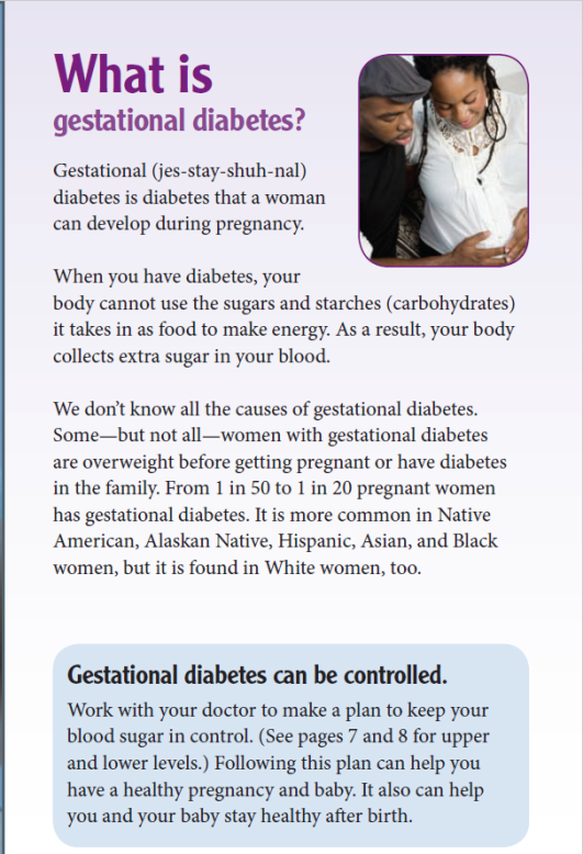 Gestational diabetes is a type of diabetes that is first seen in a pregnant woman who did not have diabetes before she was pregnant. Some women have more than one pregnancy affected by gestational diabetes. Gestational diabetes usually shows up in the middle of pregnancy. Doctors most often test for it between 24 and 28 weeks of pregnancy.